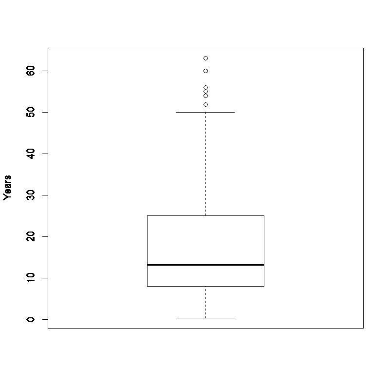 The first step one should take is to look at the data graphically. Most statistical software programs can produce boxplots (also known as box-and-whisker plots) that display the median (mid-point) and inter-quartile range (the points in the middle 50% of the dataset), as well as mathematically identify outliers based on pre-set criteria. The boxplot below represents years lived at current residents for a survey we recently completed, it displays the median (the thick line), quartiles (the top and bottom of the box), and variance (the top and bottom lines at the end of the dashed line). The six points above the top line are identified as outliers because they are greater than 1.5 times the interquartile range plus the upper quartile—a simple calculation that can be completed by hand or by using a statistical software package.