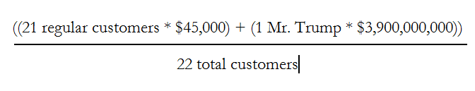 Forbes Magazine estimates that Mr. Trump is worth $3.9 billion (as of July, 2014). We will assume 70 million people eat at McDonalds daily and that there are 35,000 restaurants worldwide. If it takes 15 minutes to pick up an order, then there are about 21 customers in every restaurant at one time…on average. Let’s assume that every patron, aside from Mr. Trump, has a net worth of $45,000 (the median American net worth is $44,900). Based on these figures, we can calculate the average net worth of these customers.