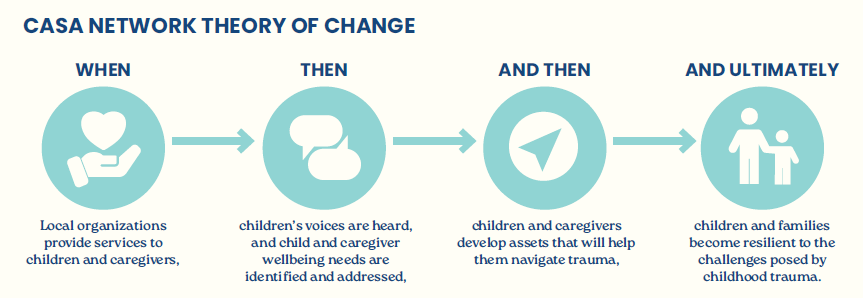 To carry out the evaluation, we audited program data collected by all 18 local organizations and conducted 34 in-depth interviews with CASA leaders, judges, child welfare professionals, parents, and youth with direct experience in the system. We used this information to revise the CASA network’s theory of change (shown below) so that it tells a clear and comprehensive story about the strategies CASA network organizations employ across the state. Then we aggregated program output data and analyzed Child Wellbeing Assessments to document CASA network outputs and outcomes.